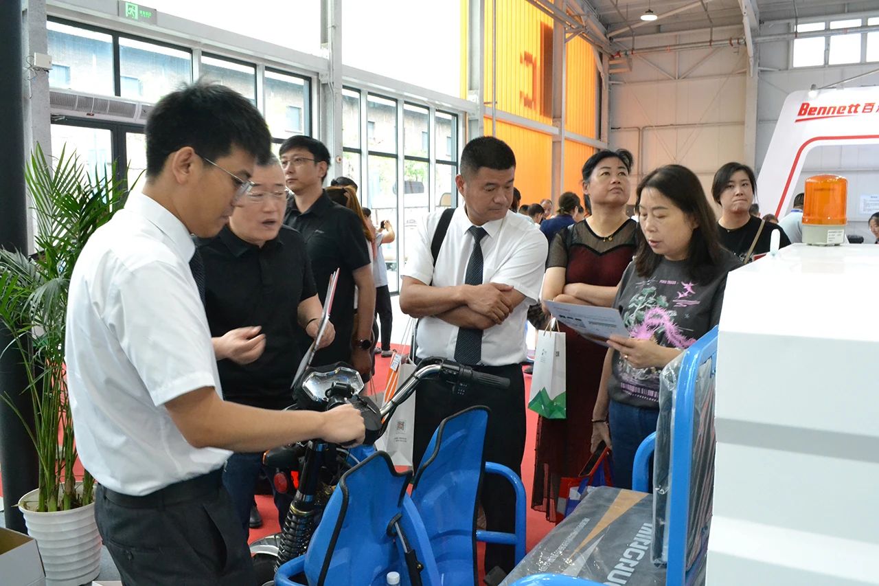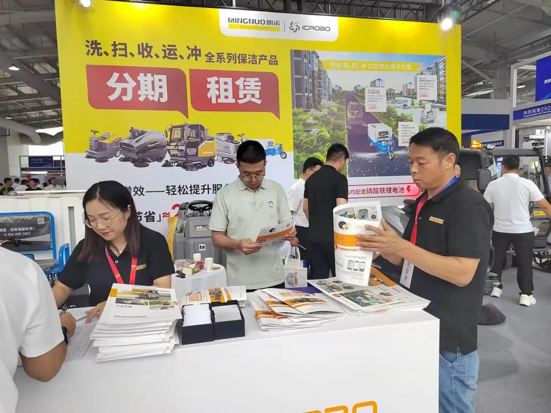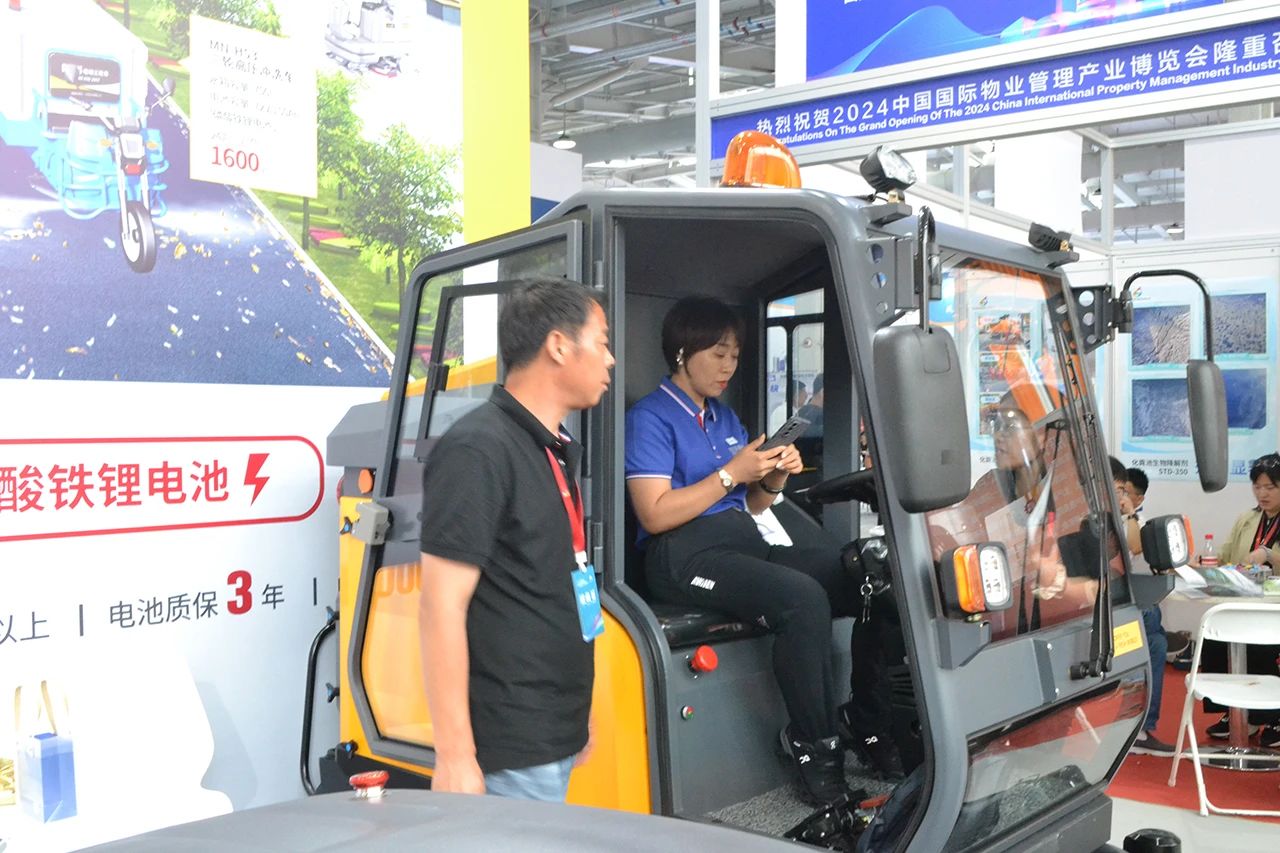 封闭式电动扫地车E810FB同样备受关注。采用全封闭设计的E810FB特别适合在居民区等环境中使用。一群物业经理围着产品经理,详细询问产品性能和价格。“这款车型采用全封闭双开门设计,升级了磷酸铁锂电池配置,增加高压冲洗功能,很适合我们的住宅项目……”明诺销售人员向一位物业经理仔细介绍着。