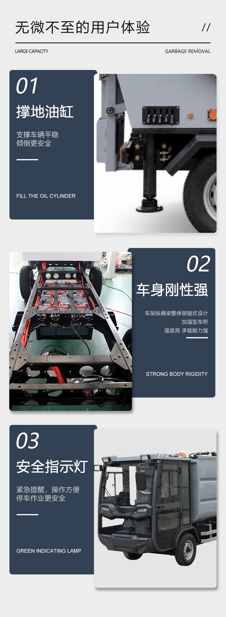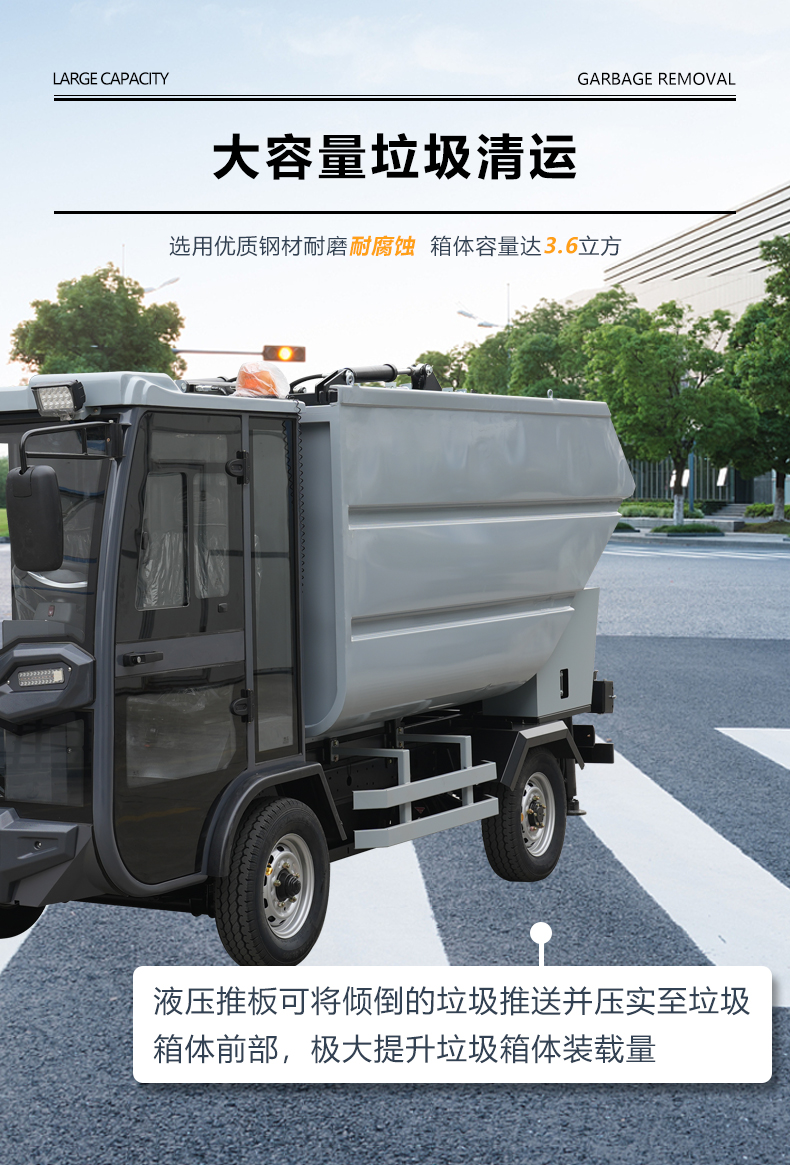 l垃圾箱采用耐腐蚀箱体, 容量达 3.6 立方, 减少频繁往返装运。