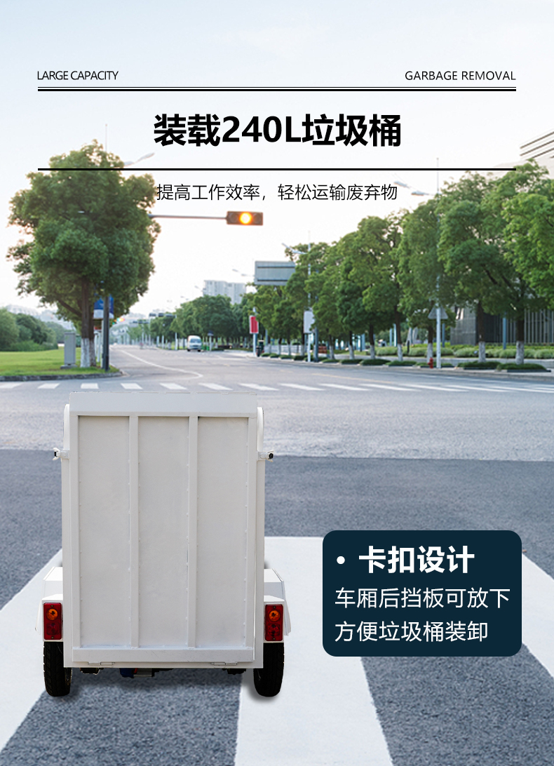 MN-H35T2三轮双桶保洁车可装载两只240L标准垃圾桶,整车操作简便,且易清洗,装卸方便,适用城镇街道、工厂、学校、医院、居民生活区、机关单位等路段垃圾收集和巡回保洁使用。随走随停,方便灵活。