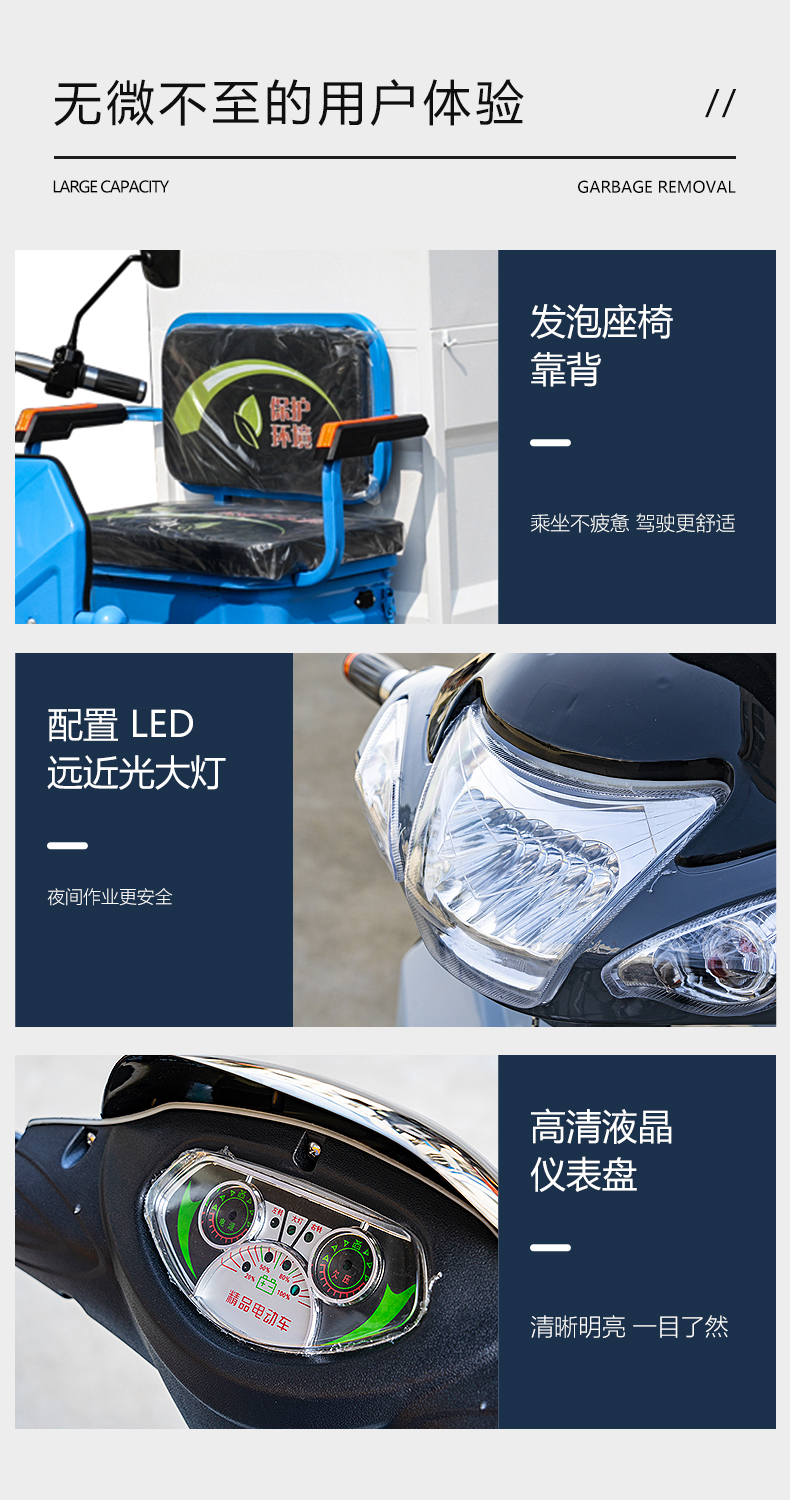 l整车装有LED照明灯、左右转向灯、刹车灯、仪表、电喇叭、后视镜、防盗报警等,有效保证行车安全。