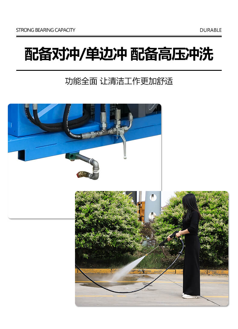 车头配置左、右测冲洗实时控制阀件,可轻松冲洗路面灰尘、树叶、油污等。