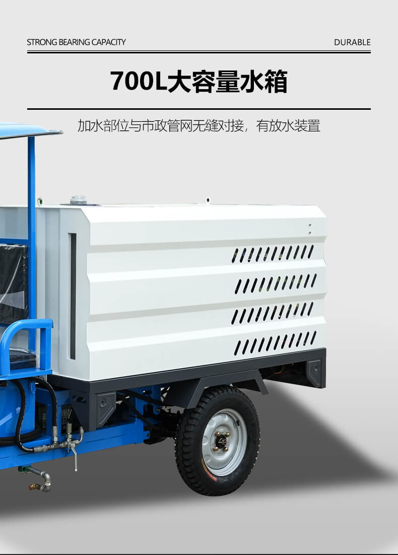 升级钣金外壳箱体有效防锈,轻松实现个性化定制涂装。加水部位与市政管网无缝对接,有放水装置,水箱容积750L,冲洗时间大大延长。
