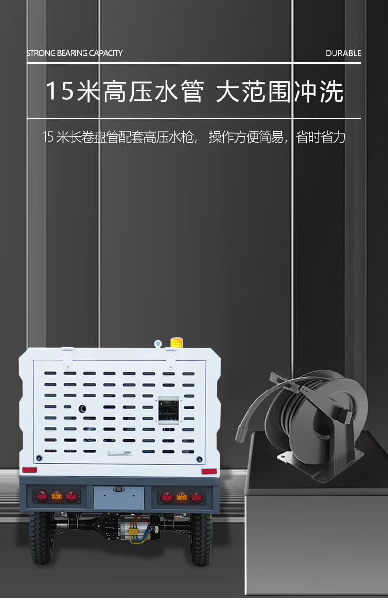 配有可移动高压水枪,自带15米水管,自动收放。
