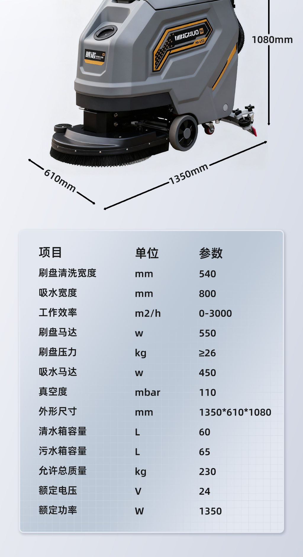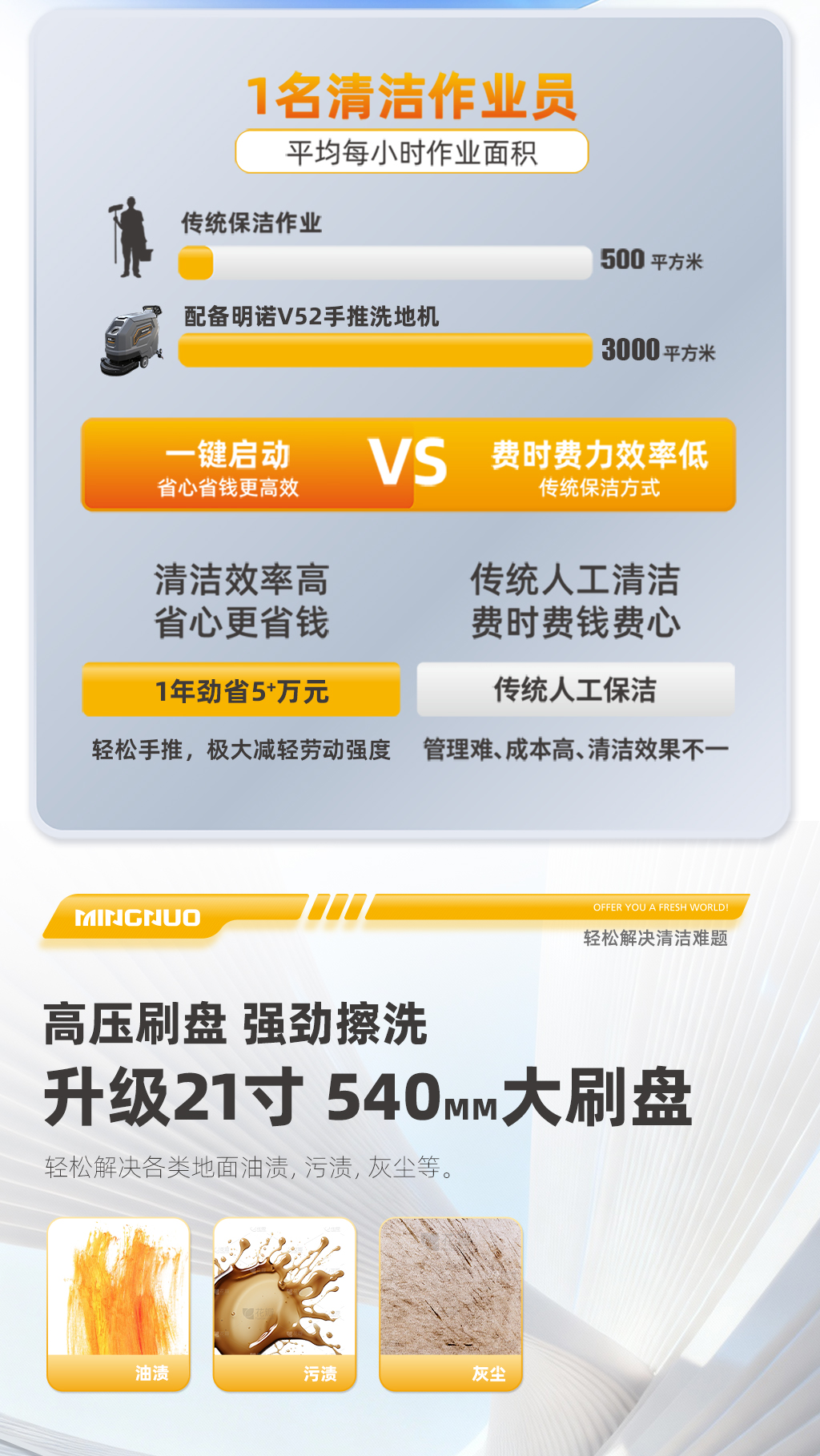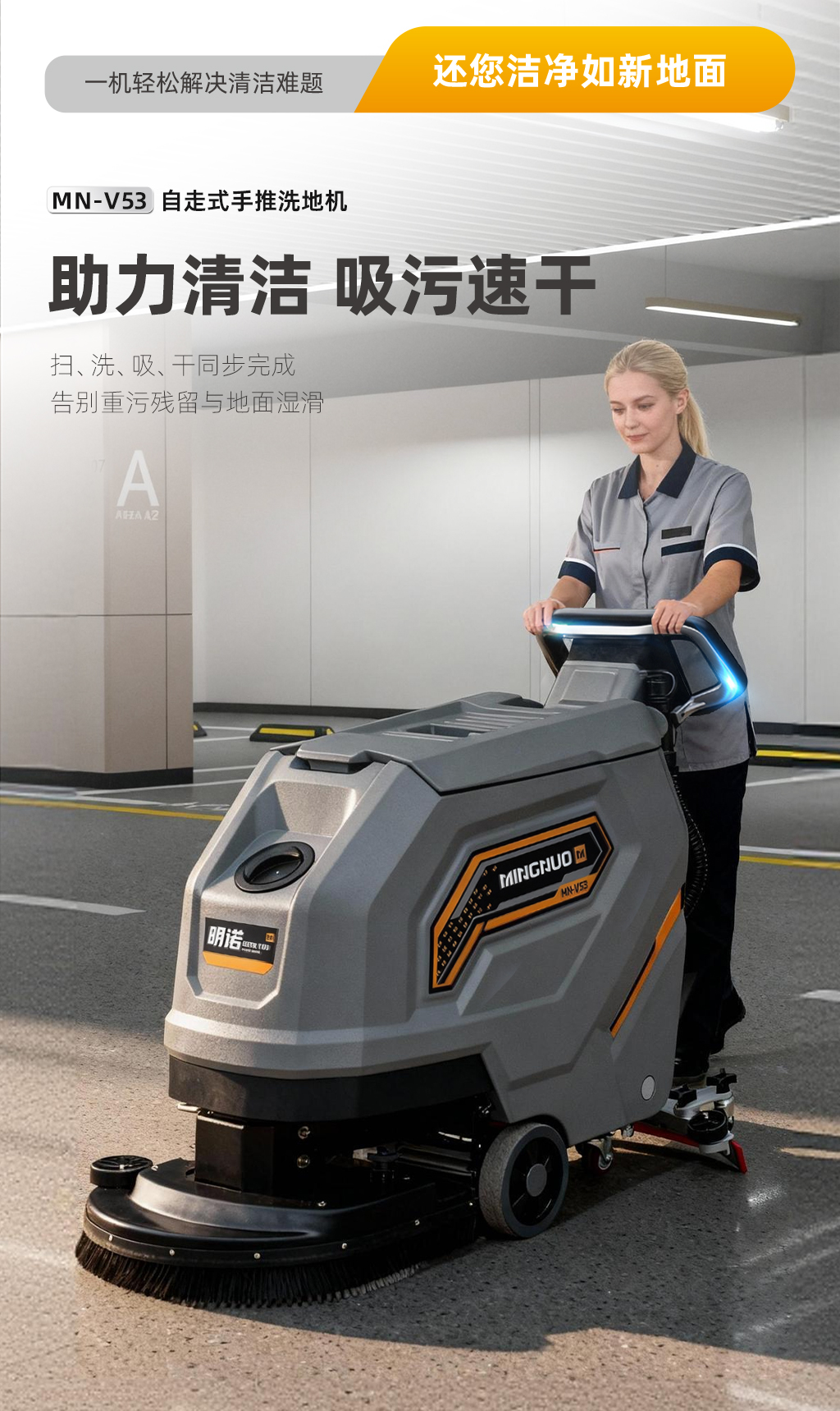 MN-V53手推自走式洗地机主要适合瓷砖、大理石、环氧地坪等大面积清洗,可添加清洁剂清理油污地面。配备 60L 清水和 65L 污水箱,是一款坚固可靠的洗地机。充足续航支持长时间作业,配合有力的触地压力,轻松应对大型商业场所清洁任务,广泛应用在零售店、生产工厂、仓储大厅和较小的物流仓库、购物中心、会议中心、机场、停车场、火车站等领域。