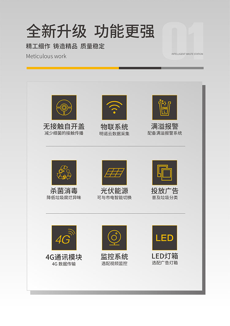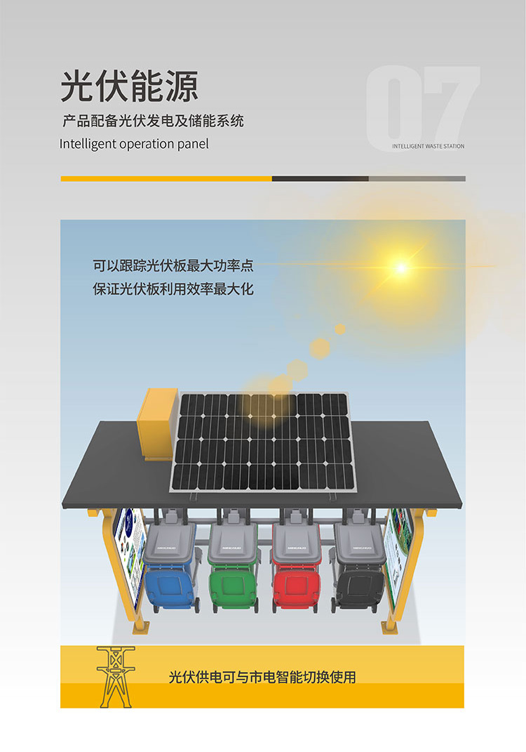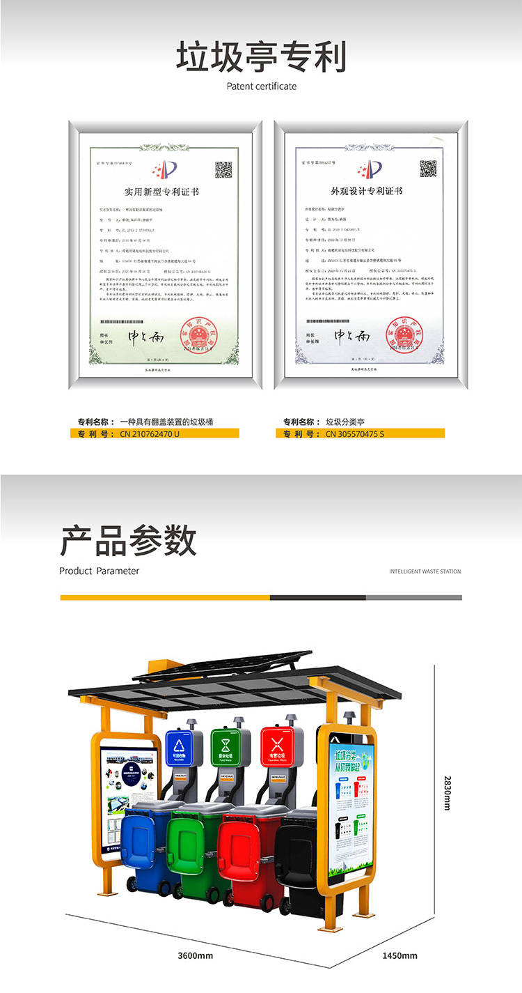 MN-ZNT智能垃圾亭采用SM-SⅢ光伏系统、ACD消杀系统、LOT云数据采集物联系统、CP智能开盖系统、240L标准垃圾桶易普及、为垃圾分类普及,方便居民投放专心打造的一款智能投放亭。