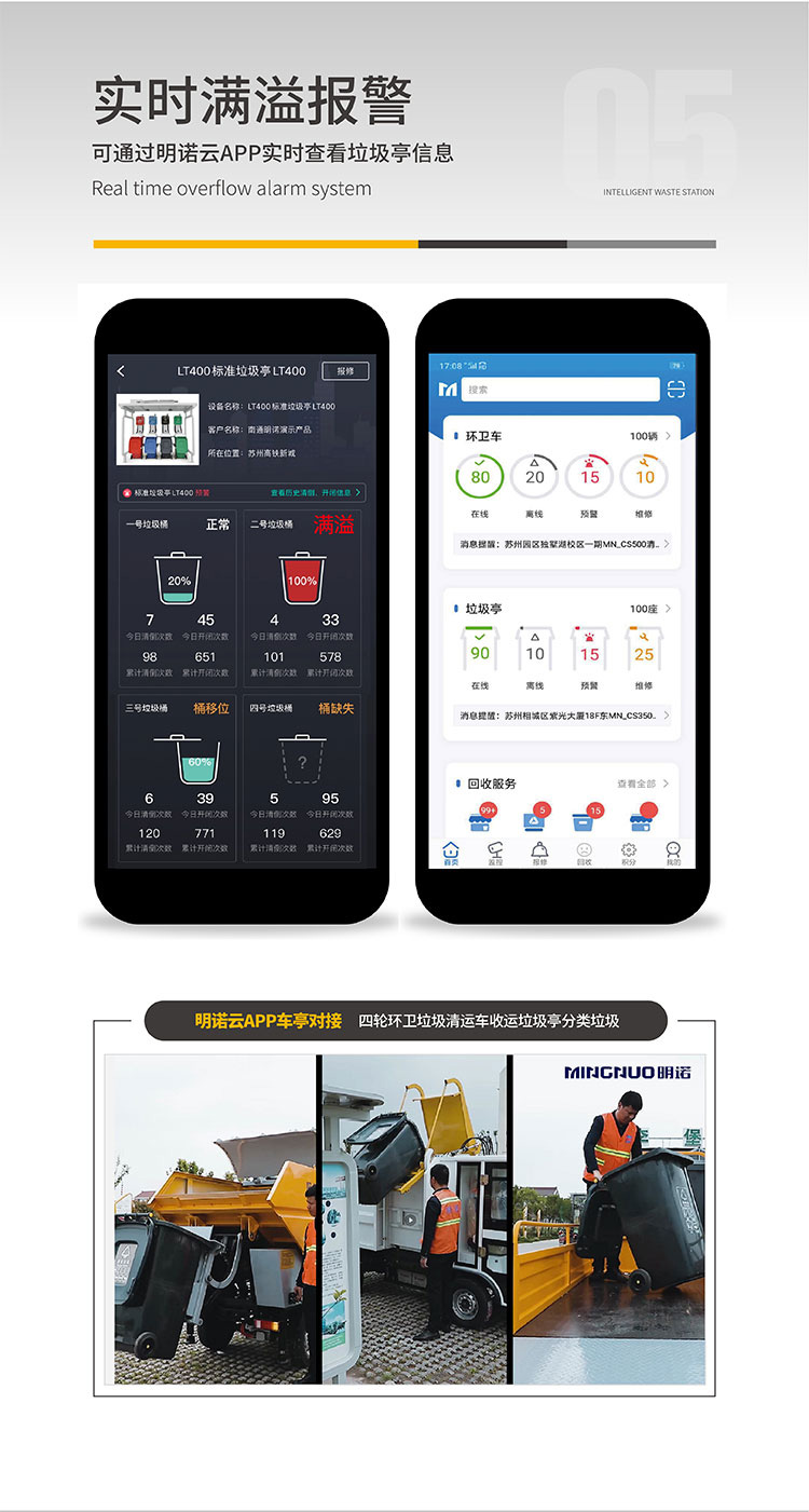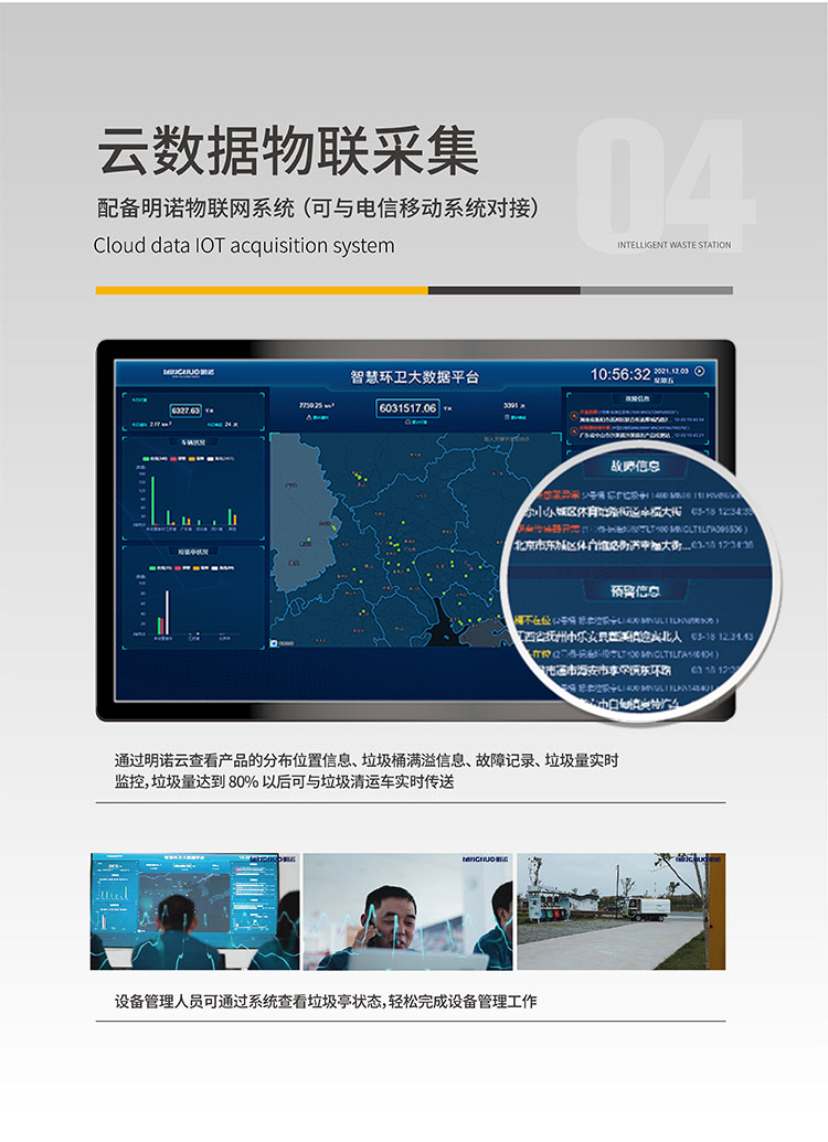 l明诺云数据采集物联系统产品配备明诺自主研发的物联网系统 (可与电信移动系统对接)可通过明诺 云查看产品的分布位置信息、 垃圾桶满溢信息、 故障记录、 垃圾量实时监控, 垃圾量达到 80% 以后 可与垃圾清运车实时传送。