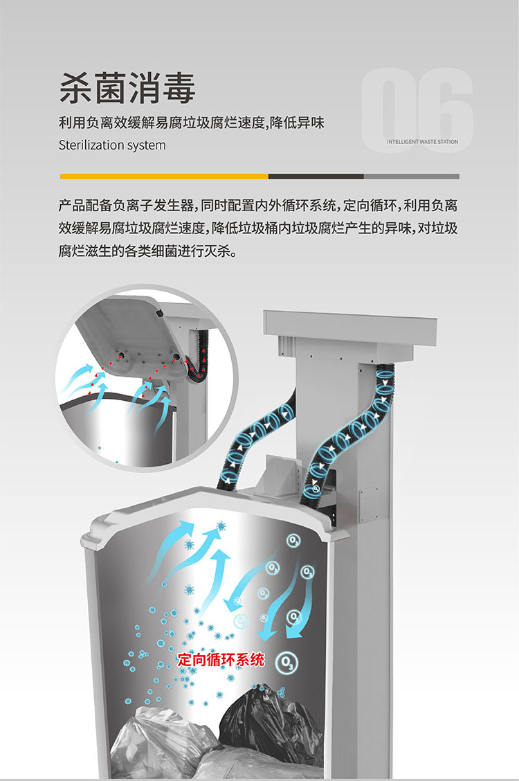 lACD 消杀系统 产品可配备负离子发生器, 同时配置内外循环系统, 定向循环, 利用负离缓解易腐垃圾腐烂速度, 降低垃圾桶内垃圾腐烂产生的异味, 对垃圾腐烂滋生的各类细菌进行灭杀。
