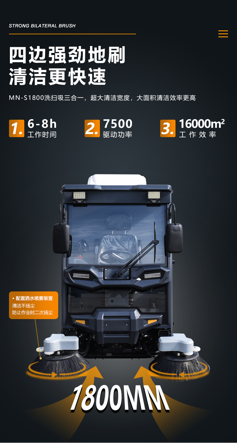 MN-S1800四轮扫地车配置液压升降前后边刷,动作灵敏安全可靠。前后加大功率边刷电机和刷盘,清理更彻底,使用寿命更长。清扫宽度达到1800mm以上,作业效率更高。边刷机构自带防撞保护功能。标配72V300Ah锂电池,工作时间长,选A品电芯,充放电循环3000次。标配冷暖两用空调和高压冲洗功能,可选配雾炮和4KW高压泵。尾部醒目箭头灯,作业提示更安全。