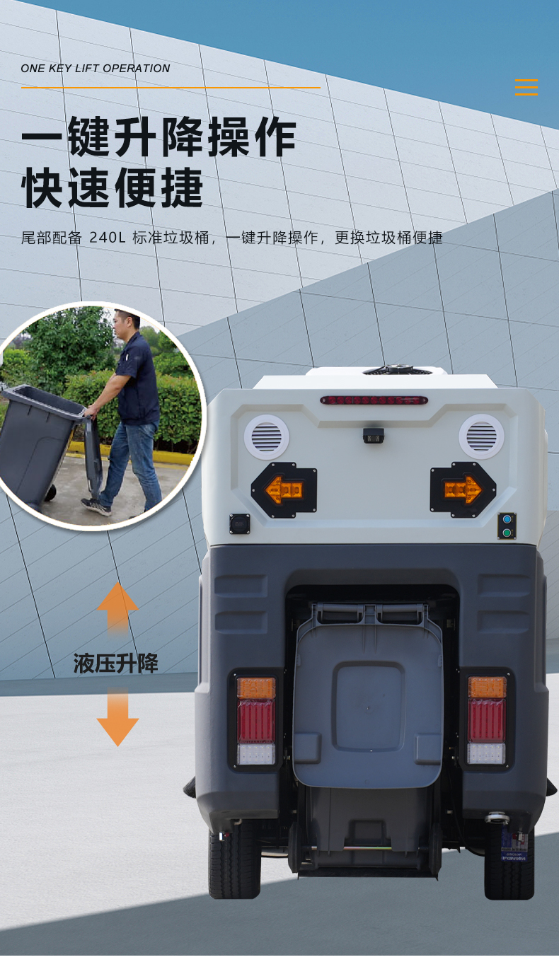 l尾部配备 240L 标准垃圾桶,一键升降操作,更换垃圾桶便捷。