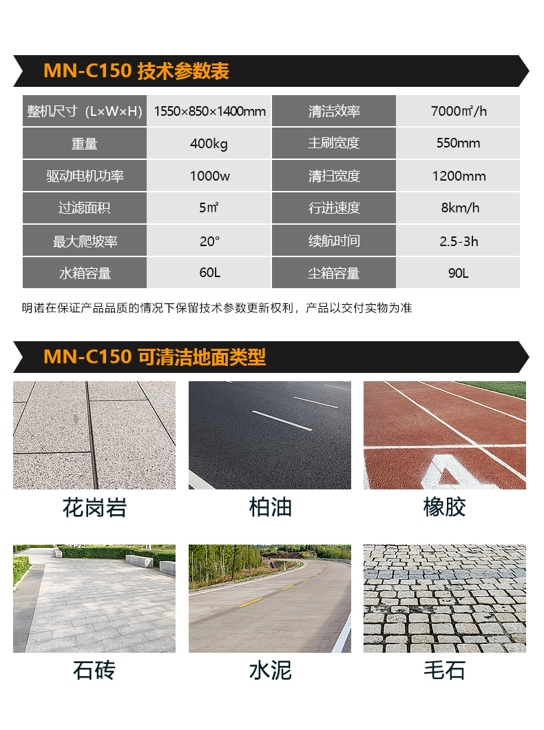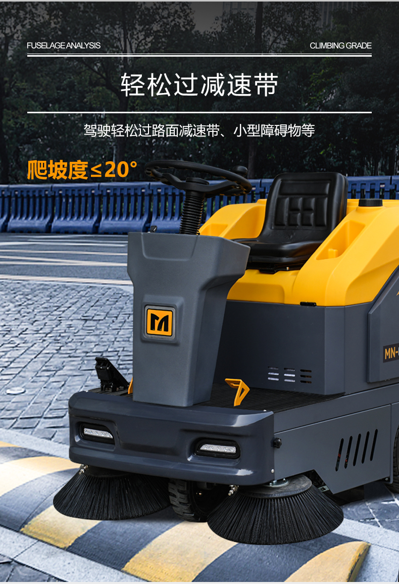MN-C150驾驶式扫地车,清洁宽度1,200mm,每小时可高效清洁7000㎡以上的地面,可有效清洁沥青,水泥,砂石,毛石等洗地机无法清洗的地面。特别适合清扫落叶、烟蒂、小石子、尘土等固体颗粒物、常规生活固体小垃圾及日常灰尘。