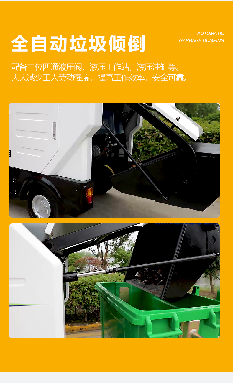 l液压自卸系统可实现高位垃圾倾倒全自动,大大减少工人劳动强度 , 提高工作效率 , 全自动操作 , 安全可靠。