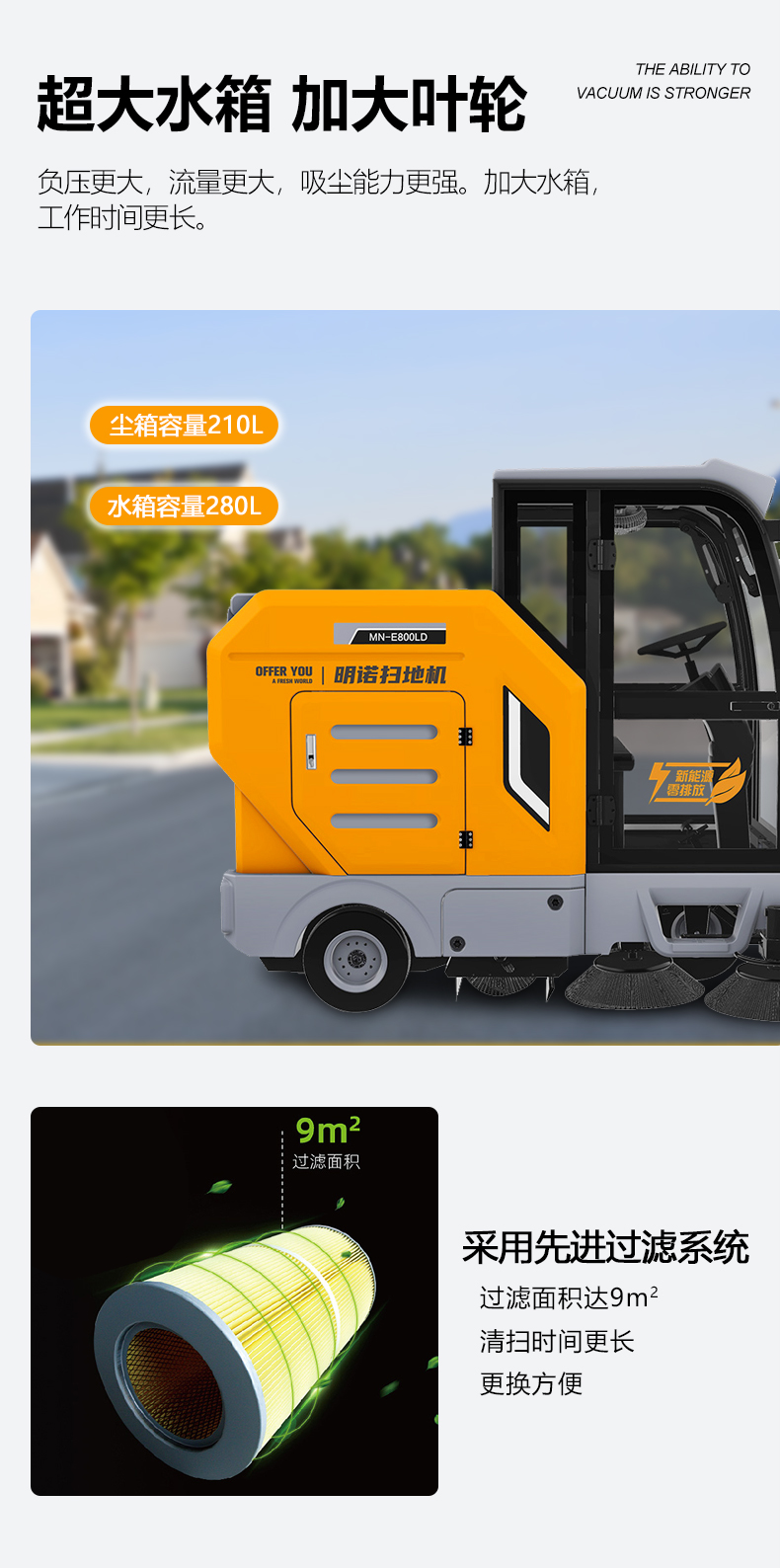 l高压涡轮风机 , 吸尘能力更强。 大容量水箱 , 容量可达 300L, 喷雾工作时间长。