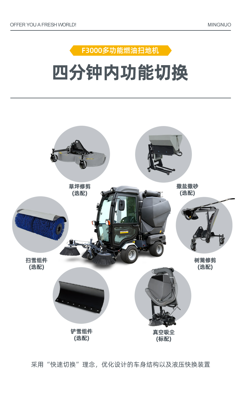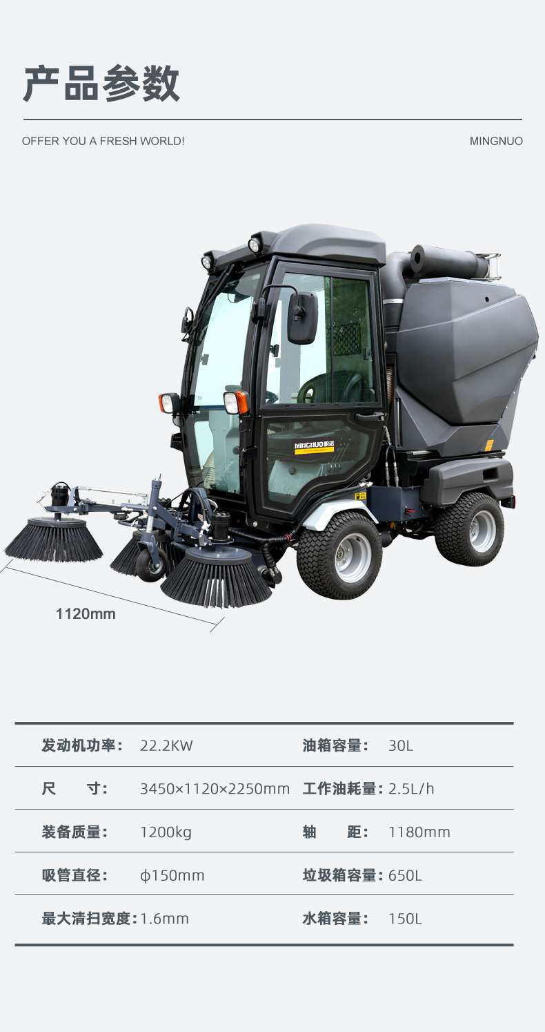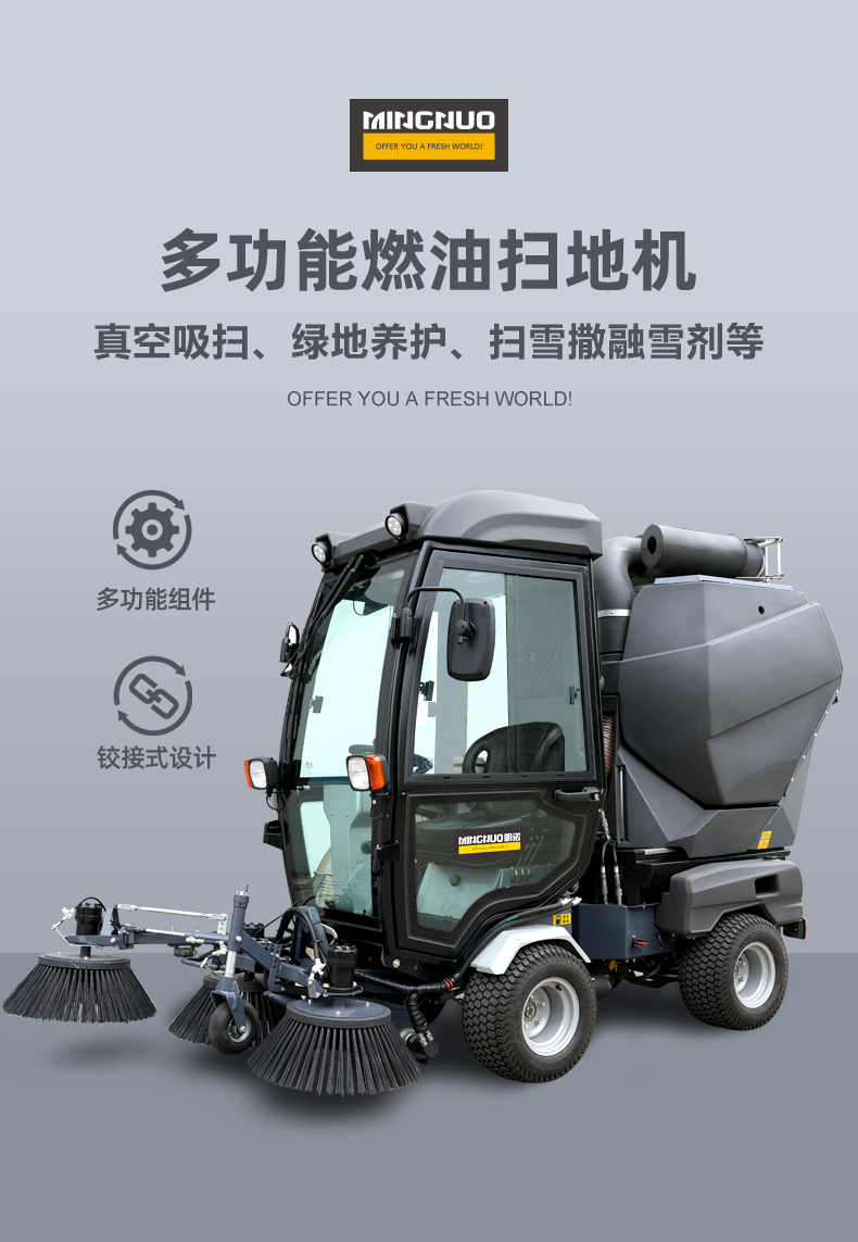MN-F3000燃油型清扫车设计高端,它被广泛应用于城市道路,人行道,非机动车道,步行街,广场,公园,绿地及停车场等,尤其适用于狭窄弯曲的道路。