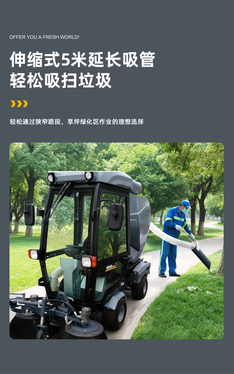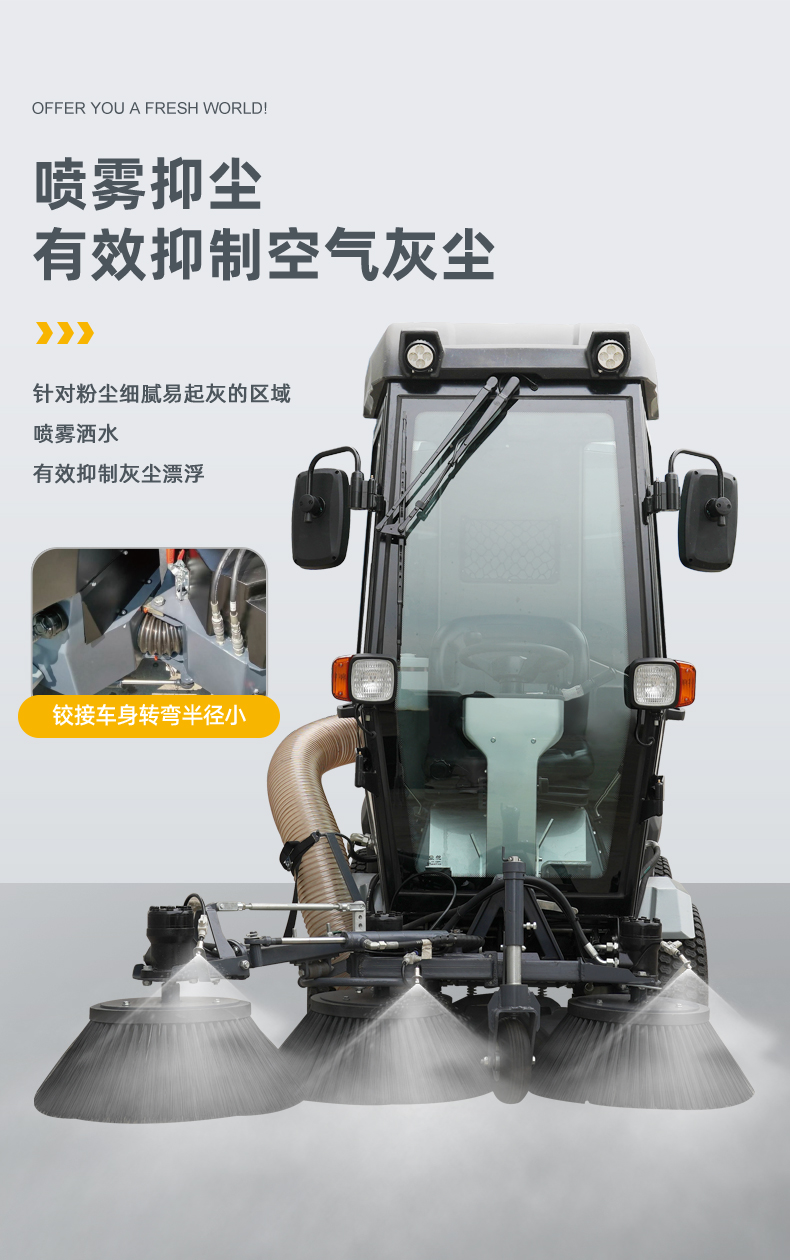 l链接方式让操控更为出色灵活,紧凑设计让这款机器可轻松在狭窄的路面和空间内工作,流线型外观,美观小巧,转向灵活,能在狭窄弯曲的非机动车及人行道上清扫自如。